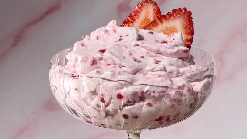 With its rosy pink color and a few sliced strawberries for garnish, this whipped dessert is seriously cute piled into cocktail glasses. Bring these over to the table and anyone will be a fool for you.